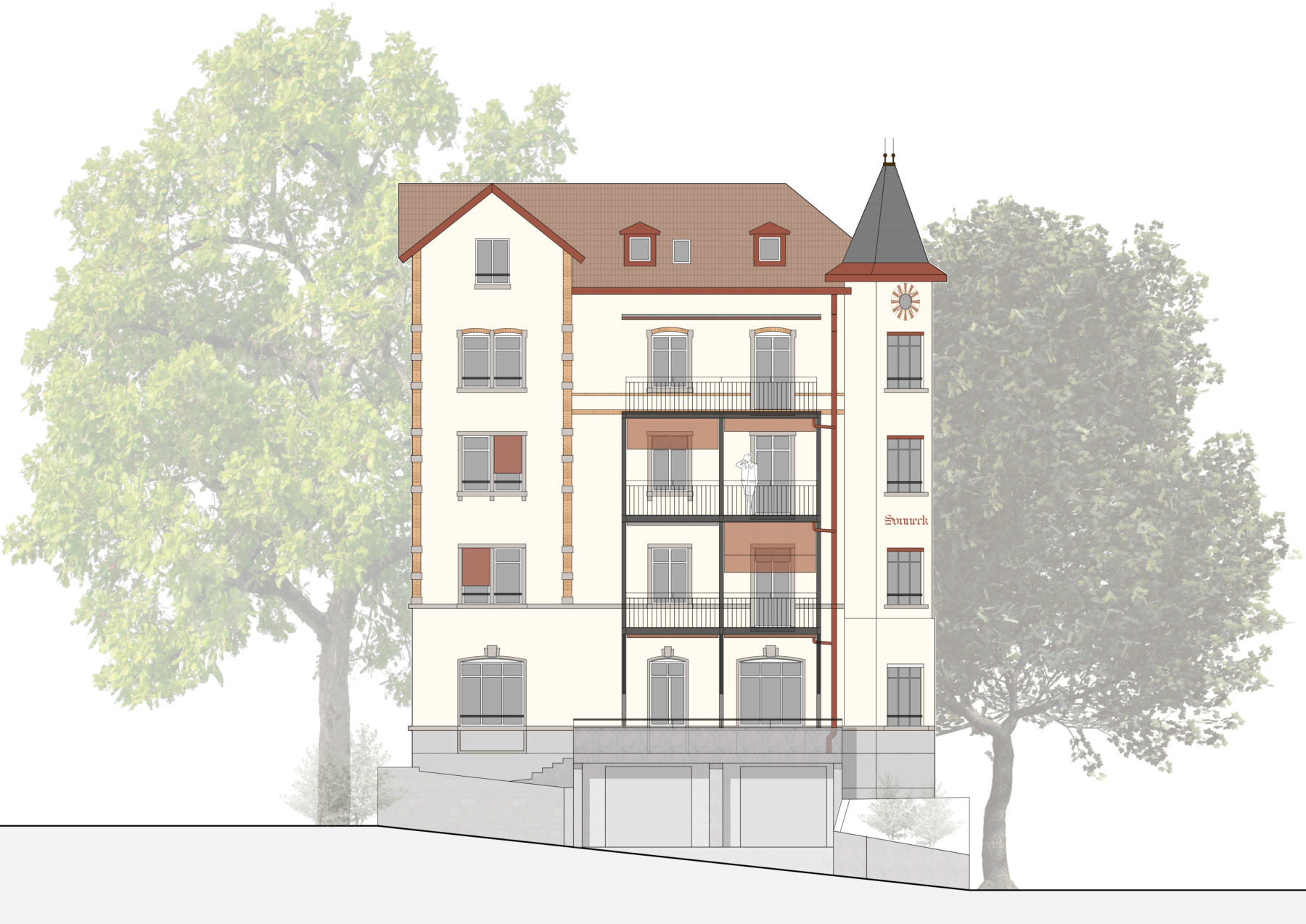 Die historische Bausubstanz wurde energetisch ertüchtigt und mit neu interpretierten, grosszügigen Balkonen ergänzt, welche den heutigen Anforderungen an Wohnkomfort entsprechen.