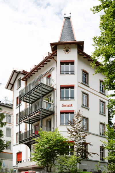 Das Wohnhaus mit grosszügig Familienwohnungen wurde um 1920 errichtet und liegt in einem ortsbildgeschützten Quartier am Rosenberg in der Stadt St. Gallen. Die Gebäudehülle – insbesondere das Dach sowie die Fassaden mit den in den 1970er-Jahren ergänzten Balkonanbauten – wies substanzielle altersbedingte Schäden auf. Aus bautechnischer wie auch denkmalpflegerischer Sicht war daher eine umfassende, zugleich sorgfältig abgestimmte Erneuerung erforderlich.