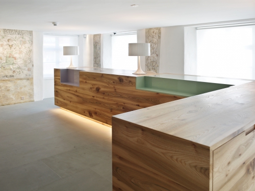 Eine warme und lebendige Atmosphäre – geprägt von Sandsteinboden, Holzmöbel und weisser Hülle – prägen die Kundenstube. Die bedeutende Renaissance Wandmalerei ziert den zurückhaltend gestalteten Raum. Die Büroräume im 1. und 2. Obergeschoss sind in schlichtem Weiss gehalten und harmonieren mit den Schreinerarbeiten aus Ulmenholz. Die astige Maserung verleiht den Oberflächen einen lebendigen Charakter.