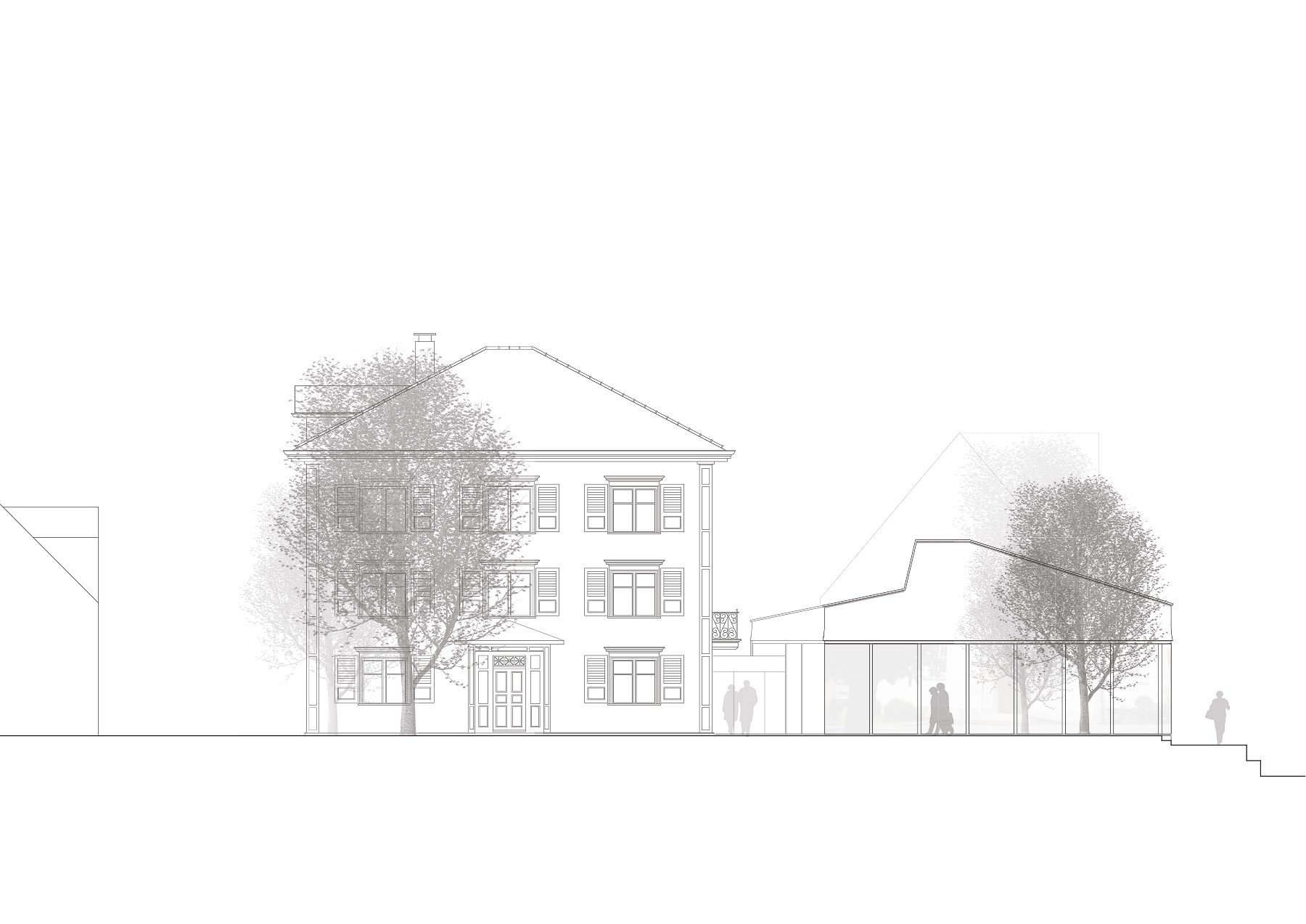 Das historische Pfarrhaus bildet den Hauptbau des neuen „gastlichen Zentrums“ der Kirchgemeinde Ebnat-Kappel. Die wertvolle Bausubstanz bleibt erhalten und wird mit minimalen baulichen Interventionen verstärkt. Die beiden Gebäude als betriebliche Einheiten funktional zu gestalten und gleichzeitig Nutzungsflexibilität und Autonomie beider Bauten zu wahren, war Ziel der Projektaufgabe.