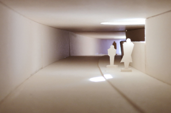 Gleichzeitig können die Velofahrer und die Fussgänger bzw. Rollstuhlfahrer während der Unterquerung der Kreuzung 2 mal, durch die 5m grossen Öffnungen, den Himmel erblicken. Bei den beiden Zugängen sind zusätzlich lineare Oberlichter vorgesehen, welche die Seitenwände aufhellen.